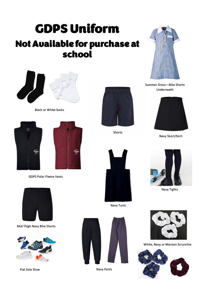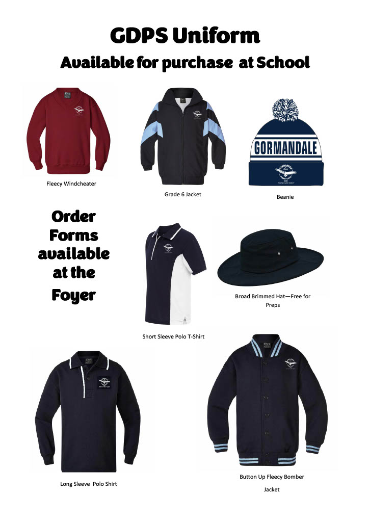 It is expected that all student’s wear Gormandale & District Primary School’s nominated school uniform. This develops a sense of unity and belonging to the school. Our school uniform allows for practical clothing for school activities and eliminates peer pressure caused by competition with styles of clothing. When all students wear our school uniform it establishes the identity of the school within the wider community. A range of uniform choices for all seasons is listed below: